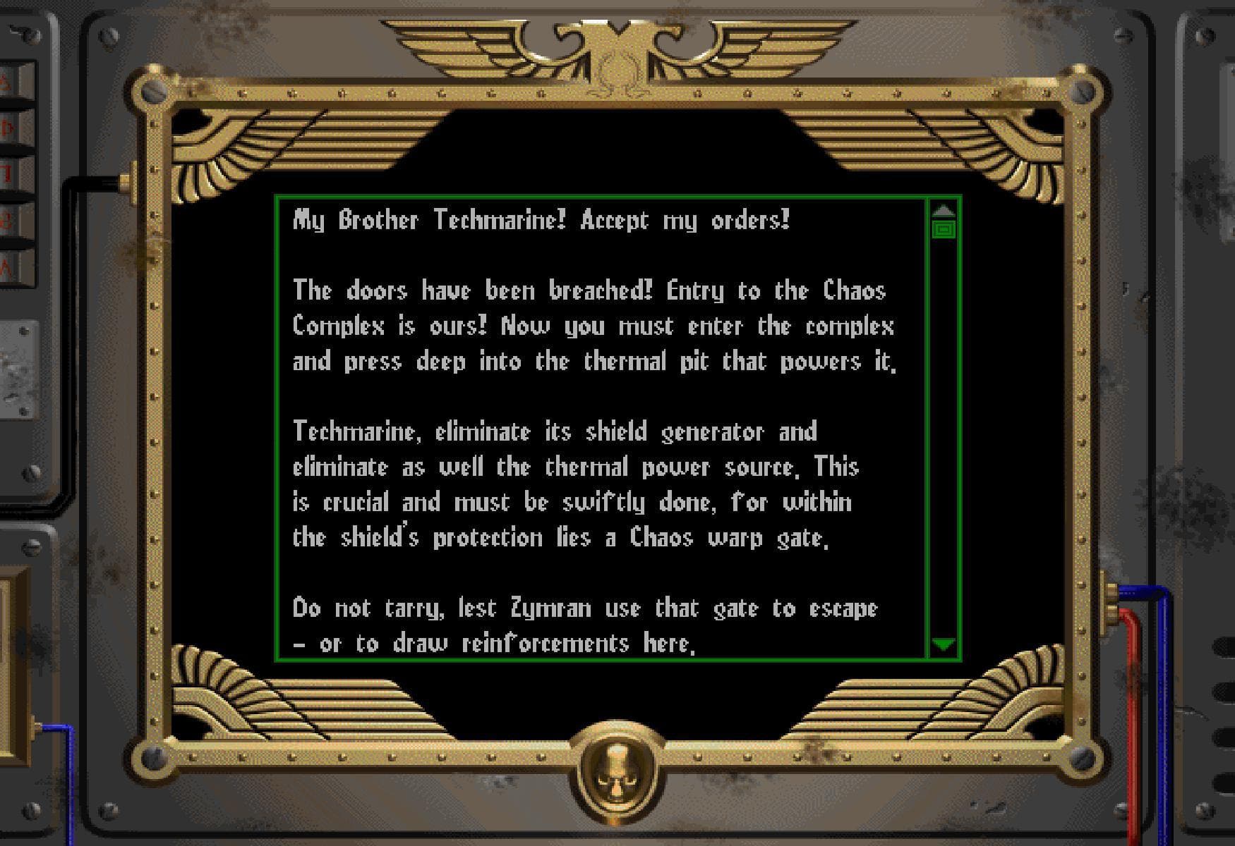Set in the Warhammer 40,000 universe, Chaos Gate tells the story of an Ultramarines army led by Captain Kruger, as he attempts to recover the Concordat Chaosium, a pre-Horus heresy artefact, from the hands of Chaos Lord Zymran’s forces. With a mighty company under your command, you must engage in campaign scenarios and skirmishes, defeating the forces of Chaos and completing objectives to bring you closer to acquiring the artefact and defeating the heretics. As a turn-based strategy with RPG elements, the game offers you the ability to fully customise your army between missions and augment your forces to ensure strategic superiority. With the might of a Space Marine company at your disposal, you can fully customise your squads down to the last marine, ensuring that only the Emperor’s finest are entering the fray. But be warned, for any suffered losses are not recovered between missions, so you must carefully decide which missions are worthy of your efforts. As SSI’s second entry in the Warhammer 40,000 universe, Chaos Gate marries the lore of the 40,000 universe with the strategic depth of an SSI game and creates an engaging experience that further glorifies the Emperor and the Adeptus Astartes’ Legacy.Battle Chaos Space Marine forces and their daemonic allies across the galaxy in a Campaign of 15+ linked scenarios or explore randomly generated missions to gain power for your Ultramarine troops. Create and customize a squad from a Space Marine contingent of 50 different soldiers, each with unique characteristics and capabilities - including Terminators, Assault Marines and Devastator Squads. Build custom missions with the extremely flexible Mission Editor. Command the vehicles of the Warhammer 40,000 universe: Predator tanks, Rhino APCs, Land Speeders and Dreadnoughts.